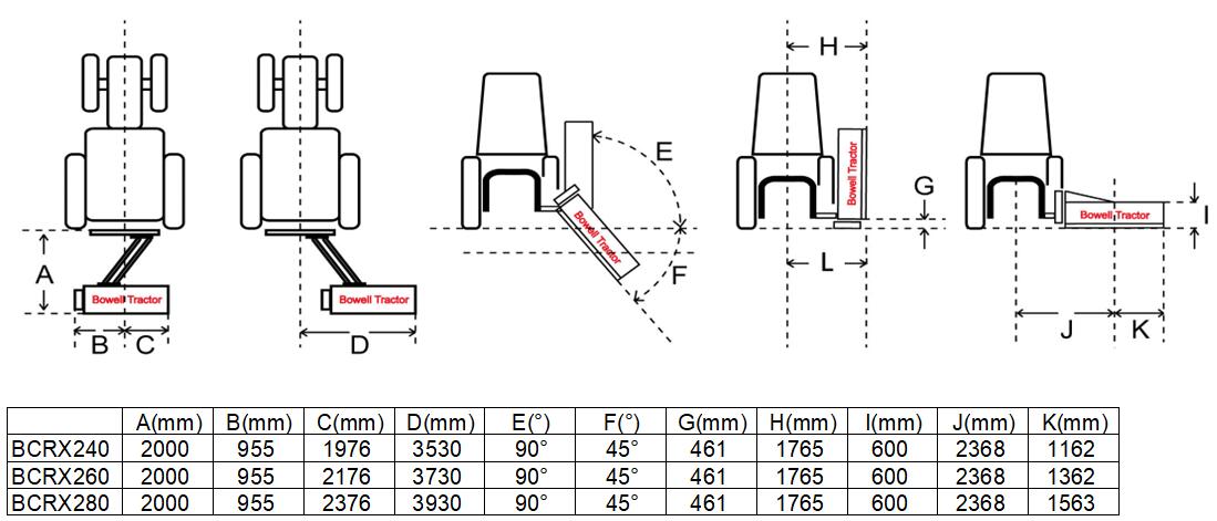 Oberhalb der Tabelle der technischen Daten finden sie detaillierten Abmessungen der Bowell Böschungsmulcher. Sie können an Hand der Grafiken und Abmessungen ablesen, wie sich der Seitenmulcher hinter Ihrem Traktor positioniert und welche Reichweite der Schlegelmulcher horizontal oder vertikal an Ihrem Traktor erreichen kann.