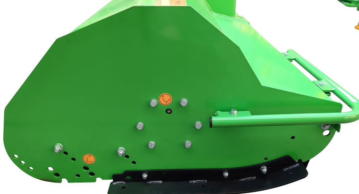Nach Abschaltung des Zapfwellenantriebs wird keine Bewegung mehr auf das Zapfwellen-Getriebe Ihres Traktors übertragen. Möglich ist dies durch das große Bondioli&Pavesi Freilaufgetriebe und das Nachlaufen der schweren Rotorwelle. Der Böschungsmäher ist mit Steinschlagschutz-Metall-Lamellen ausgestattet, dadurch wird das Umherfliegen von Fremdkörpern und Steinen an der Frontseite des Mulchers verhindert.