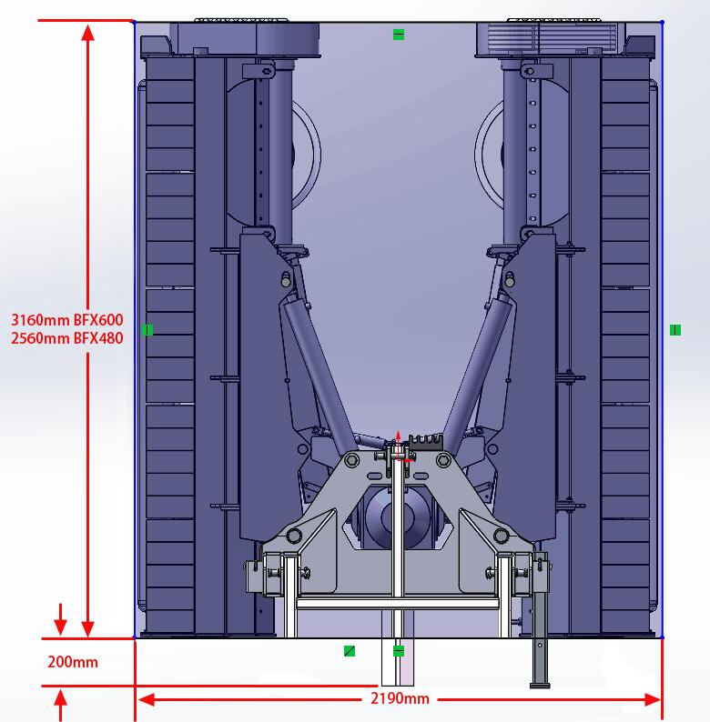 For wide and heavy fail mowers, using very high RPM on the rotor shaft, a torsion-resistant and low vibration housing is the precondition for a reliable machine. Next to massive side walls, which are 10mm thick on the Bowell BFX-series, best results are achieved when using double walled housings. The Bowell BFX-mower comes with a 6mm strong outer housing in addition to a 5mm thick inner housing on more than 90% of the housing surface. Both housings are welded and bolted together. This leads to a very smooth operation of this professional implement.