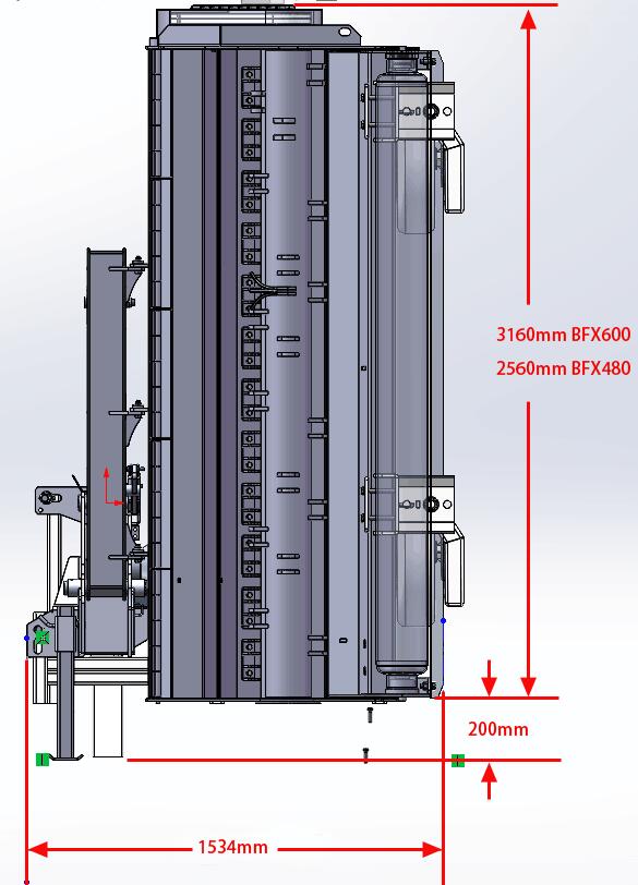 The foldable Bowell BFX flail mower series is equipped with a very powerful double sided transmission made by the italian factory CMR, making it the perfect choice for large tractors with up to 250hp. With available working widths of 480cm or 600cm, Bowell`s professional BFX foldable mowers are designed for large farms with the need for high work efficiancy when cutting grass, crop residues, cornstalks and shredding branches or twigs. In combination with the right tractor BFX-mowers are superior to almost any vegetation and offer the highest work efficiency. The hydraulic folding mechanism will reduce the transport width to 220cm within seconds for easy transport on puiblic roads.