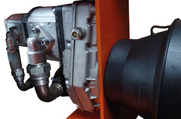 Über die mitgelieferte Gelenkwelle treibt der Traktor ein Übersetzungsgetriebe an, das mit einer speziell entwickelten Doppel-Hydraulikpumpe verbunden ist. Dies gewährleistet einen besonders ruckfreien getrennten Antrieb des gerade angebauten Arbeitsgerätes und der Hydraulikzylinder des Arms.