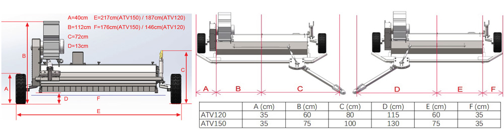 Der ATV-Schlegelmulcher wird üblicherweise mit seitlich montierten Rädern betrieben, die es auch kleineren Zugfahrzeugen möglicht ist, das 223 kg bzw. 263 kg schwere Mähwerk sicher zu manövrieren. Für besondere Anwendungen in der Nähe von Zäunen, Gebäuden oder anderen Abgrenzungen können die Räder auch hinter dem Mähwerk positioniert werden, so daß Sie bis ganz an Bäume, Büsche oder Gebäude heranmähen können. Dadurch steigt aber die Stützlast an der Anhängerkupplung erheblich.