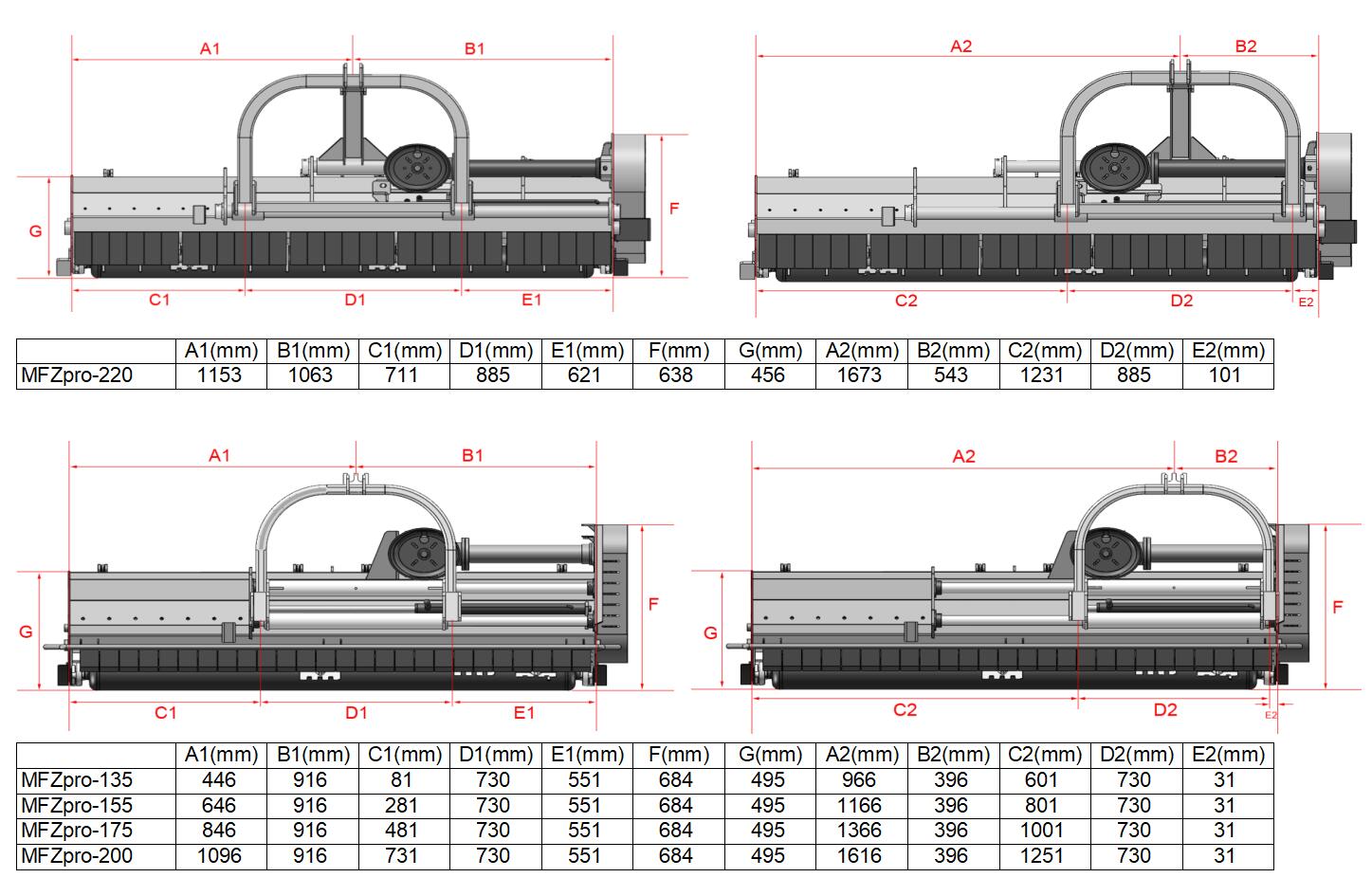 Unter dem soliden 5 mm bis 8 mm starkem Gehäuse der MFZpro Mähwerke befindet sich eine lasergewuchtete Rotorwelle mit 10 bis 18 jeweils ca. 1,2kg schweren und gehärteten Hochleistungs-Schlegeln. Die Schlegel haben auf der Innenseite abgeschrägte Flächen, an der Ablagerungen kaum anhaften können. Eine nochmals verbesserte, spiralförmige Anordnung der Schlegel auf der Rotorwelle garantiert maximale Performance bei minimalem Kraftaufwand für den Traktor. Die Mulcher der MFZpro Serie sind mit verstärken Rotorwellen ausgestattet, die über einen Durchmesser von 127mm und einer Wandstärke von 10mm verfügen. Durch den größeren Durchmesser erhöht sich auch die Schlegelgeschwindigkeit von bisher 41 mtr/sec auf 46,5 mtr/sec und damit deren Leistungsfähigkeit.