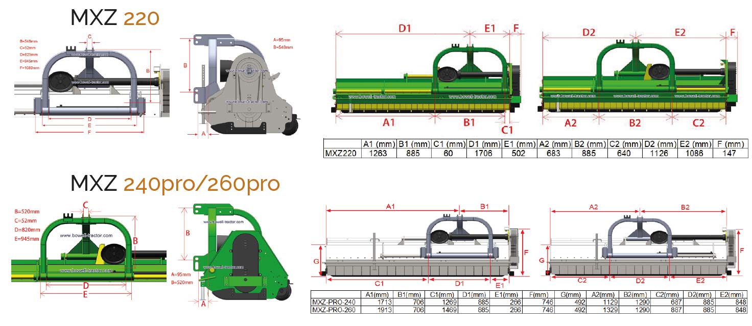Die Bowell MXZ / MXZpro Mulcher Serie ist mit einem schweren und leistungsstarken Winkelgetriebe des italienischen Herstellers Comer ausgestattet und kann so von mittleren und größeren Traktoren optimal eingesetzt werden. Die professionellen hydraulischen Mulcher können mit einer lieferbaren Arbeitsbreite von bis zu 260 cm und der hydraulischen Seitenverschiebung von 50 cm überall dort eingesetzt werden, wo stark verholzte Pflanzen oder Astwerk bearbeitet werden müssen.