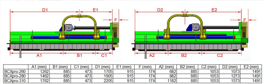 Das doppelseitig ausgeführte Comer Winkelgetriebe ermöglicht bei entsprechend ausgestatteten Traktoren auch einen Betrieb an der Fahrzeugfront. Das Comer Getriebe wird mit 1000U/min Gelenkwellengeschwindigkeit betrieben. Die Bowell BCXpro Mulcher sind bereits mit einer doppelten Dreipunktanlenkung ausgestattet, so daß ein schneller Wechsel zwischen Front- und Heckanbau jederzeit möglich ist.