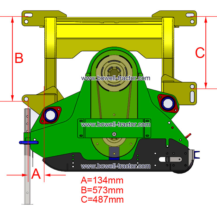 Das doppelseitig ausgeführte Bondioli Pavesi Winkelgetriebe ermöglicht bei entsprechend ausgestatteten Traktoren auch einen Betrieb an der Fahrzeugfront. Das Getriebe kann mit bis zu 1000U/min Gelenkwellengeschwindigkeit betrieben werden. Die Bowell BCX Mulcher sind bereits mit einer doppelten Dreipunktanlenkung ausgestattet, so daß ein schneller Wechsel zwischen Front- und Heckanbau jederzeit möglich ist.