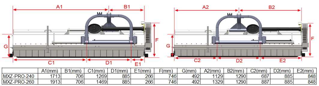 Je nach Arbeitsbreite sind die MXZpro Mulcher mit 18 bis 20 der breiten und schweren, speziell geformten 1,2kg Bowell Hochleistungs-Schlegel ausgestattet, die auch bei hartnäckigem Unterholz, Buschwerk und Restholz bis 50 mm Durchmesser für ein optimales Mähergebnis sorgen. Die neu entwickelten Gegenschneiden im Inneren des Gehäuses des hydraulisch seitenverschiebbaren Mulchers verbessern die Zerkleinerung entscheidend. Mit der schweren, selbstreinigenden Nachlaufwalze wird die Schnitthöhe eingestellt. Dies verhindert, dass der Mulcher bei Bodenwellen in den Boden mäht.