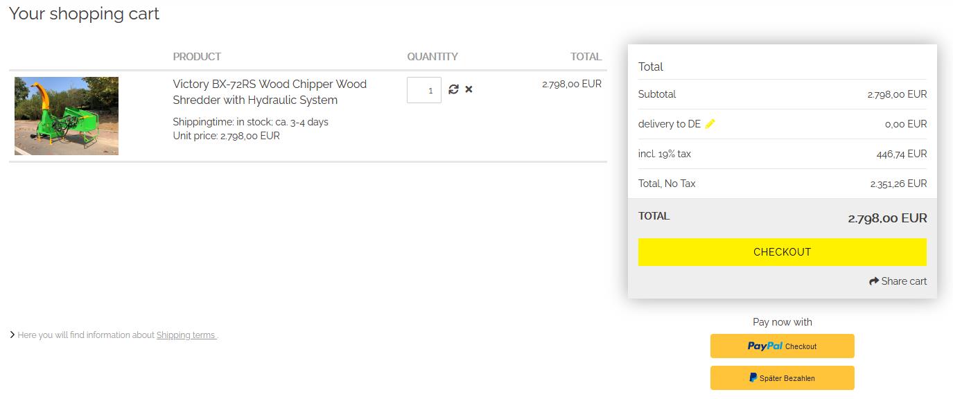 We currently offer 9 different payment terms inside Germany. The payment terms in other EU countries may vary depending on the local conditions. After you place a product into your shopping cart this is what you will see: