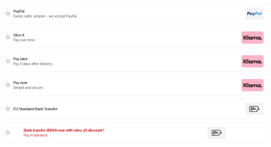 After you enter your address and select the shipping mode, this is the list of available payment terms you can choose from, which may not be available in all EU countries.